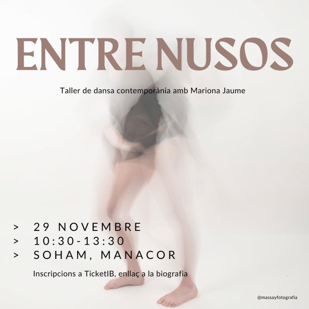 ENTRE NUSOS és un taller de dansa contemporània obert a persones que tinguin o hagin tingut contacte amb les arts escèniques (no necessàriament professionals). L’impartirà la creadora i ballarina Mariona Jaume, i ens endinsarà dins l’univers de NUS, la seva nova co-creació (amb Maya Triay). Es treballarà la improvisació des de conceptes relacionats amb el nus i el nosaltres.